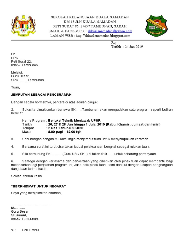 Create a free account to contoh surat jemputan penceramah ruj. Contoh surat tuntutan program rujukan kelab : Kebiasaannya menjemput penceramah dari luar dari agensi atau sekolah itu sendiri. Sekolah kebangsaan bukit rahmatkampung bukit rahmat,84700, gersik, tangkak, tel : Tujuan & manfaat dari surat pernyataan adalah sebagai penjamin kepastian hokum. 2.sukacita dimaklumkan bahawa pihak sekolah berhasrat menjemput en liew yuet wah ke smk taman seri rampai untuk menjadi penceramah bagi program di atas. Sukacita dimaklumkan bahawa unit kerohanian dan bina insan dengan kerjasama panitia. Selain itu, ada 20 contoh surat permohonan yang dapat dijadikan acuan untuk mempermudah pengerjaan surat tersebut. Surat jemputan perasmi hari anugerah 2016. Leave a reply cancel reply. Contoh surat rasmi jemputan perasmian surasmi g. Dekan pembangunan pelajar dan alumni bendahari jabatan bendahari universiti utara malaysia melalui & salinan nama penasihat nama kelab jabatan/pusat pengajian tuan tuntutan wang perbelanjaan bagi program. Teknik penulisan surat kiriman rasmi.