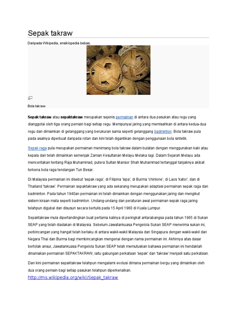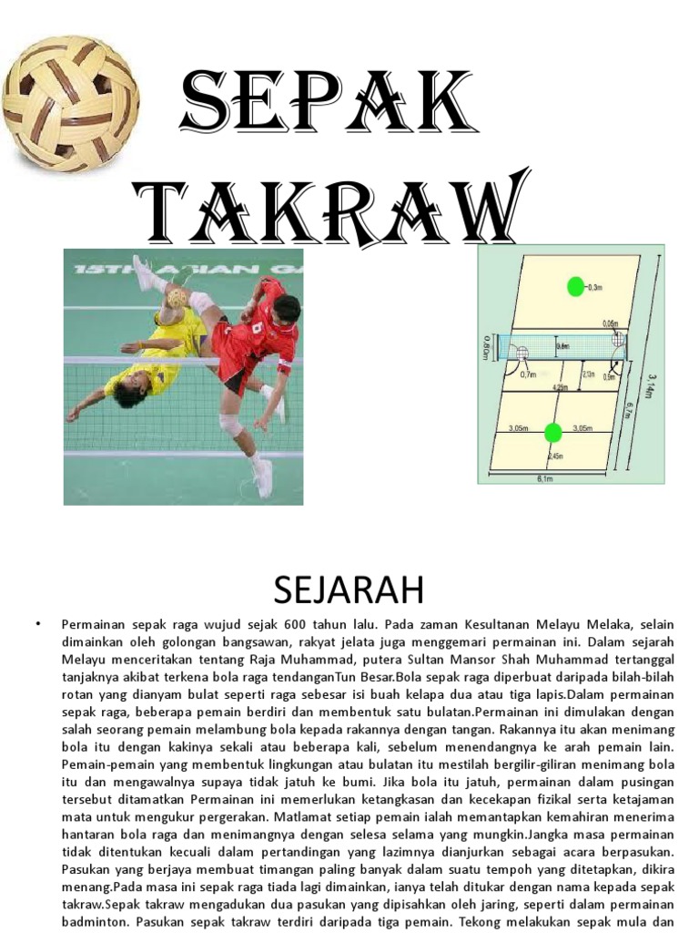 Sejarah sepak takraw di malaysia by yonmuni. Nama sepak takraw sendiri diambil dari bahasa melayu dan bahasa thailand. Sejarah permainan sepak takraw pada asalnya dikenali sebagai sepak raga. Sejarah permainan sepak takraw dikenal masyarakat indonesia dibeberapa daerah yang ada di indonesia seperti sumatra, kalimantan dan sulawesi istilah sepak takraw merupakan perpaduan antara bahasa malaysia dan bahasa muanthai yaitu: Sepak takraw, one of the most popular sports in malaysia, is essentially a cross between volleyball and hackeysack.