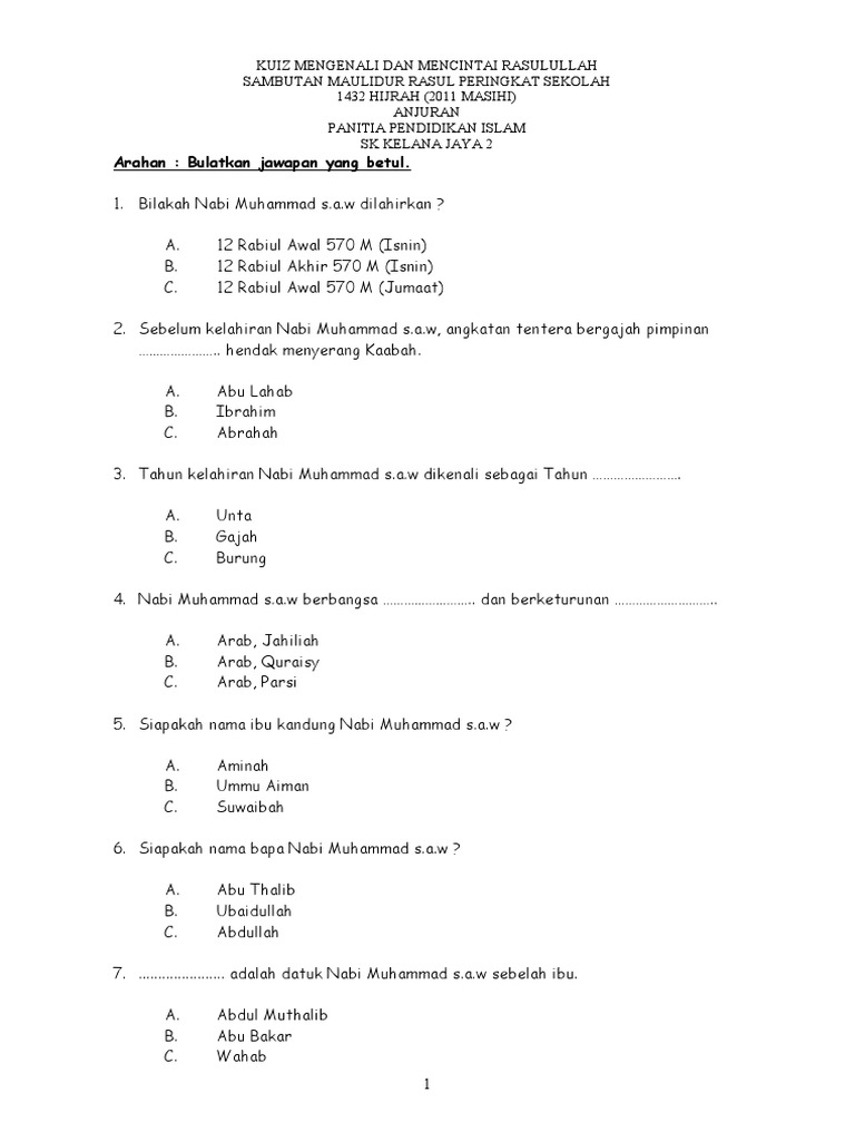 Kuiz maulidur rasul akan diadakan pada sepanjang bulan rabiul awal 1433h. Soalan kuiz maulidur rasul ( wasatiyyah penjana kesatuan ummah )(pra sekolah) 1. Kelahiran rasul) atau maulud nabi muhammad saw ialah hari bersejarah keputeraan nabi muhammad. Share & embed soalan maulidur rasul. Nabi isa alaihi salam 2.