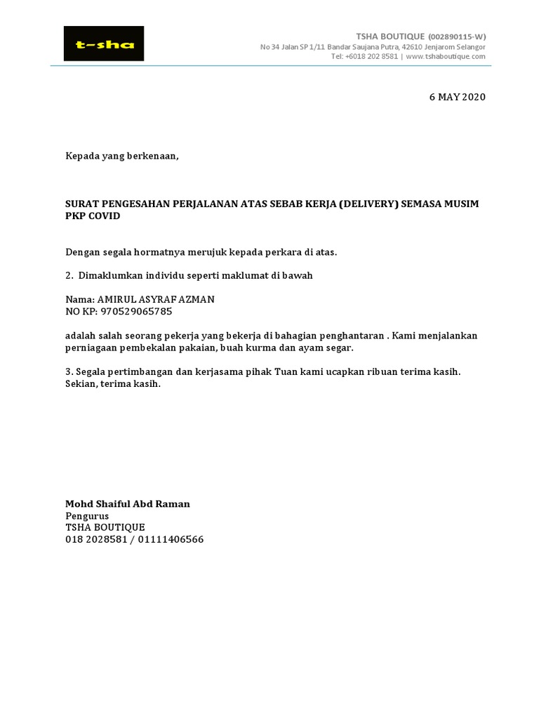 Kepada yang layak, sila buat tujuan surat kebenaran bekerja semasa pkp. Contoh surat yang akan dibahas kali ini adalah surat lamaran kerja. For more information and source, see on this link : Penerima vaksin tidak perlu surat polis. Perintah kawalan pergerakan bersyarat (pkpb) bermula 9 november 2020 hingga 6 disember 2020 telah diumumkan oleh majlis keselamatan negara (mkn) dan berkuatkuasa kepada seluruh negeri di semenanjung malaysia kecuali perlis, kelantan dan pahang.
