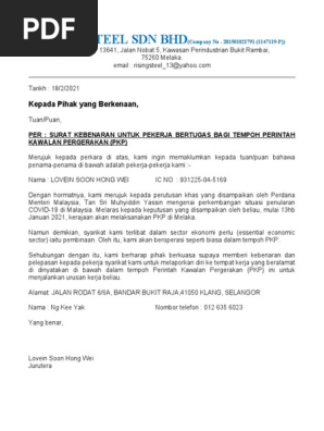 Contoh surat kebenaran bekerja ini terdiri daripada sektor awam dan juga swasta untuk memudahkan anda. Surat kebenaran perjalanan untuk ke tempat kerja mp3 & mp4. Pada 15 april laku kerajaan memberi kebenaran merentas negeri kepada mereka yang ingin membawa ahli keluarga. Contoh surat yang akan dibahas kali ini adalah surat lamaran kerja. Download secara percuma contoh surat kebenaran bekerja semasa pkp di selangor, pulau pinang, kuala lumpur kl, putrajaya dan labuan, johor, sabah dan melaka dan lokasi pkpb yang boleh dijadikan surat pelepasan pergerakan dan perjalanan termasuk rentas negeri semasa keluar rumah. Tuan/puan, surat kebenaran untuk bekerja dan rentas daerah semasa tempoh perintah kawalan pergerakan bersyarat (pkpb). Harap gunakan draft surat diatas untuk tujuan bekerja ya dan jangan gunakan untuk penipuan nak rentas daerah atau negeri. Surat pernyataan ini dijadikan sebagai bukti bahwa perusahaan yang bersangkutan berstatus non pkp dan tidak wajib menerbitkan faktur pajak. Yap, sama seperti judul besar yang tertera di atas. Borang kebenaran boleh dimuat turun di facebook polis diraja malaysia atau portal rasmi pdrm melalui pautan berikut 1. Yang bekerja, tunjuk surat kebenaran perjalanan daripada majikan. Kerajaan telah mengumumkan perintah kawalan pergerakan (pkp) di seluruh negara malaysia kecuali sarawak adalah sehingga 4 februari 2021. Perintah kawalan pergerakan bersyarat (pkpb) bermula 9 november 2020 hingga 6 disember 2020 telah diumumkan oleh majlis keselamatan negara (mkn) dan berkuatkuasa kepada seluruh negeri di semenanjung malaysia kecuali perlis, kelantan dan pahang.