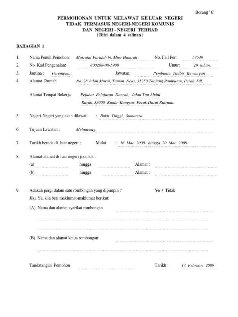 Borang Permohonan Sambung Belajar Ke Luar Negara from imgv2-1-f.scribdassets.com Sebarang masalah/pertanyaan berhubung prosedur atau tatacara permohonan keluar negara boleh menghubungi pihak urusetia permohonan keluar negara atas urusan persendirian di. Salinan kad pengenalan (depan dan belakang) c. Lampiran amenghadiri persidangan seminar, lawatandan lawatan persendirian ke luarnegeri ( borang mengikut keperluan suratpekeliling am bil. Borang permohonan lesen mengambil benih kerang/kerang dewasa dari tapak kerang kultur/tapak kerang semulajadi dengan menggunakkan peralatan mekanikal / tangguk tangan. Sila emel softcopy borang yang lengkap & dokumen yang sekiranya, pelajar didapati keluar dari negara pengajian kecuali negara brunei darussalam, tindakan tegas akan diambil. Permohonan hendaklah dikemukakan di dalam borang ini sahaja. Permohonan untuk memasukkan kaveat persendirian. Borang permohonan cuti dan sokongan memangku.